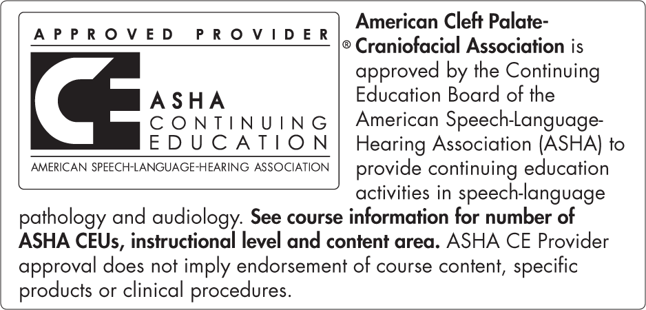 The American Cleft Palate Craniofacial Association (ACPA) is approved by the Continuing Education Board of the American Speech-Language-Hearing Association (ASHA) to provide continuing education activities in speech-language pathology and audiology.